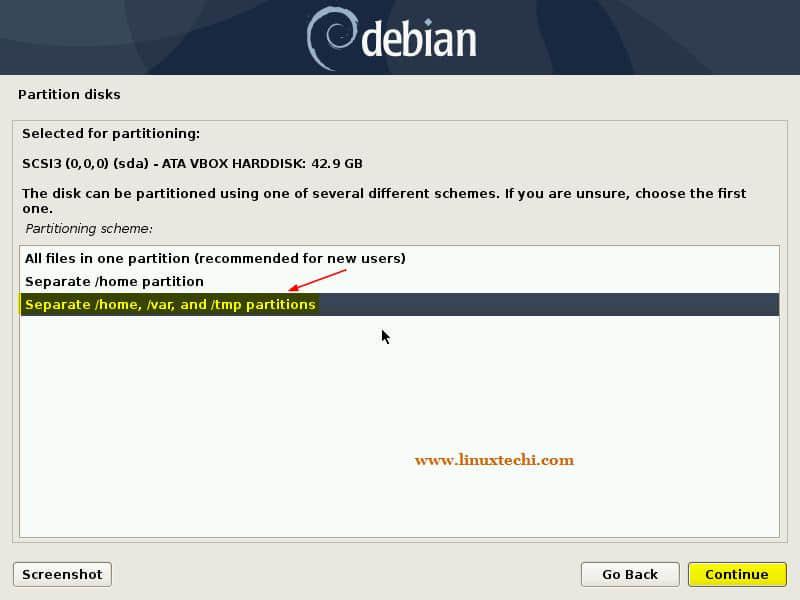 在接下来的屏幕中,你将被要求选择分区,如果是 Linux 新用户,那么选择第一个选项。假使你想要一个独立的 home 分区,那么选择第二种方案,否则选择第三种方案,它们将为 /home、/var 和 /tmp 创建独立的分区。