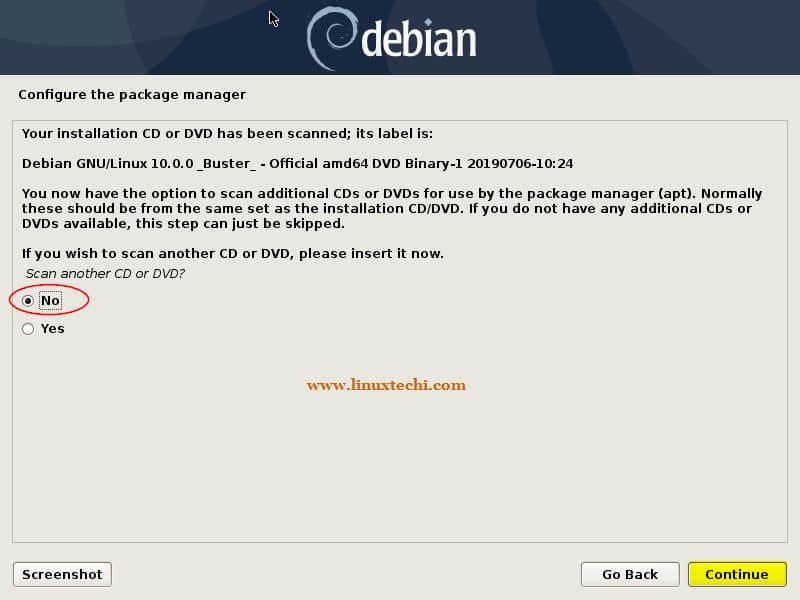 在安装期间,安装器将提示你扫描 CD/DVD 以配置软件包管理器,选择 “No” ,然后在 “Continue” 上单击。