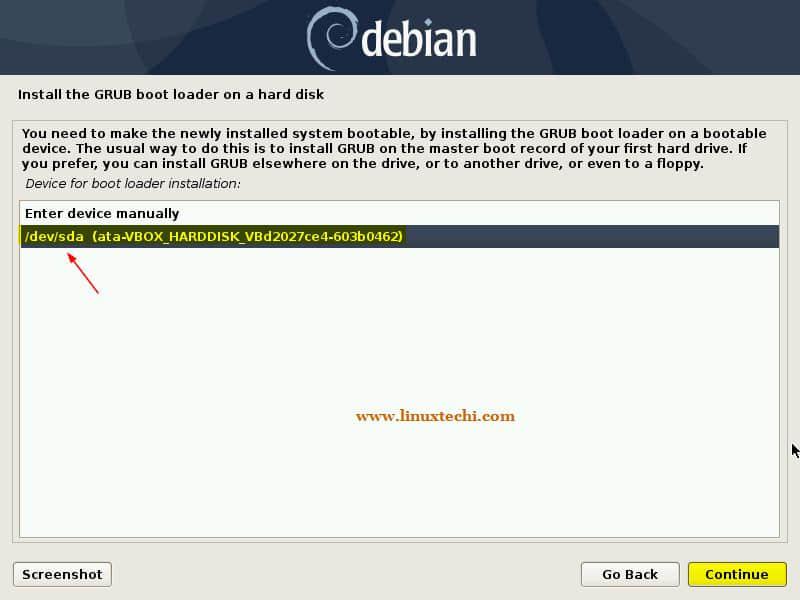 在 “Continue” 上单击来继续,然后在接下来的窗口中选择将安装引导加载程序的磁盘(/dev/sda)。