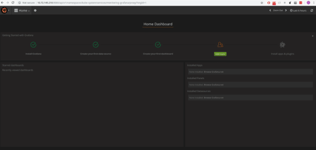 https://127.0.0.1:8001/api/v1/namespaces/kube-system/services/monitoring-grafana/proxy,你将看到 Grafana 仪表,如下图: