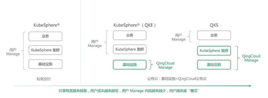 开源的 KubeSphere 与云平台是完全解耦的,这意味着 KubeSphere 可以运行于任何公有云基础设施之上,而当 KubeSphere 根植于青云QingCloud 自身所提供的基础设施时,就出现了 QKE。