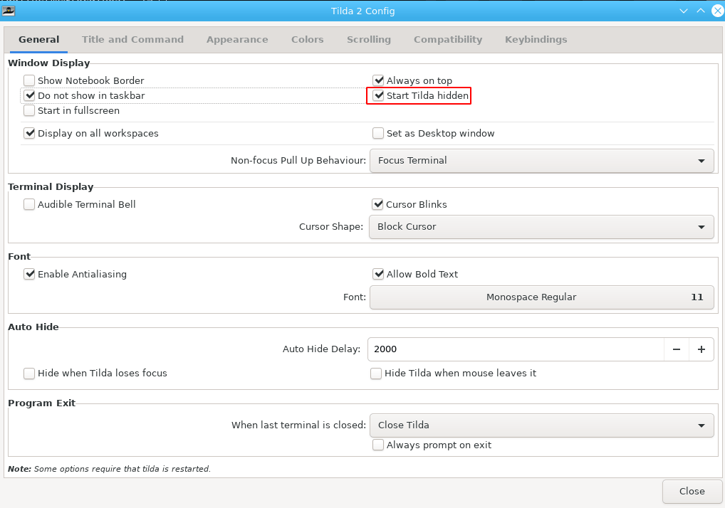 接下来,打开 Tilda 配置窗口。 选择“隐藏启动 Tilda”,即启动时不会立即显示终端。