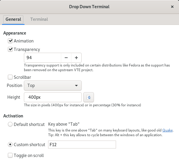 安装后,将打开 Drop-down Terminal 配置窗口以设置首选项。例如,可以设置终端大小、动画、透明度和使用滚动条。