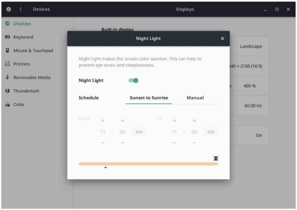 为启用这个特色,导航到系统设置 >> 设备 >> 显示 ,并打开夜光。