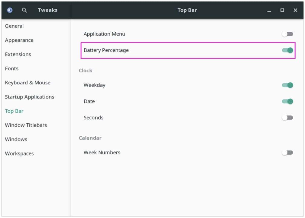 启动 GNOME Tweaks >> 顶部栏 >> 电池百分比 ,并打开它。
