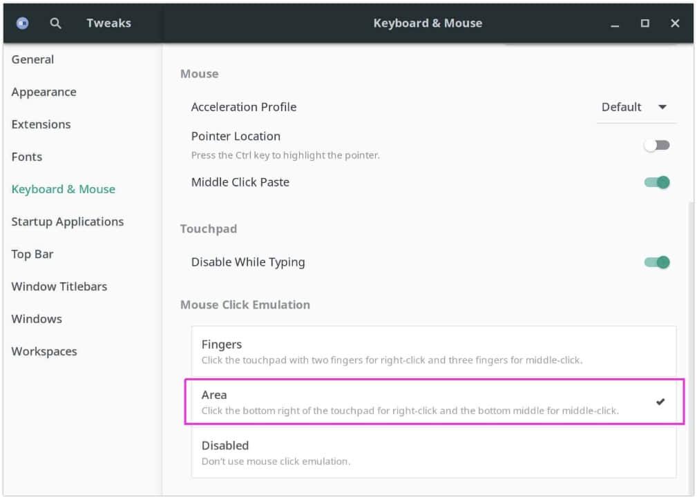 启动 GNOME Tweaks >> 键盘和鼠标 >> 鼠标点击硬件仿真,并选择“区域”选项。