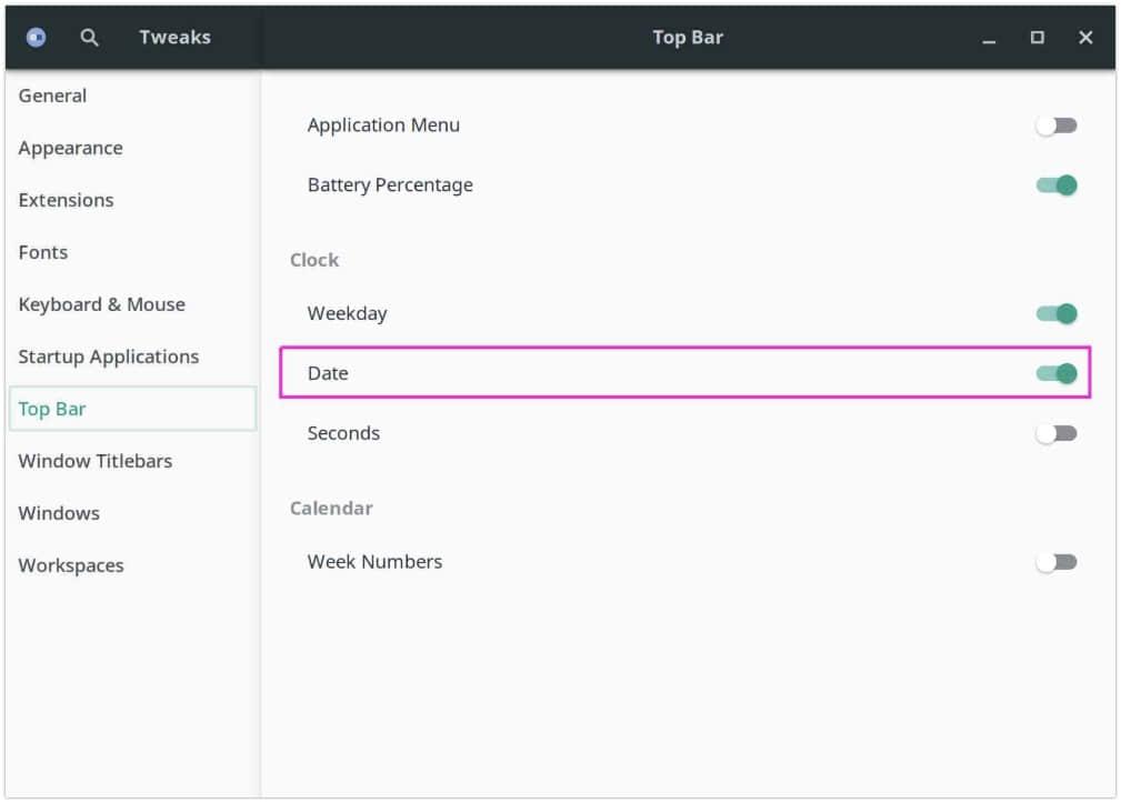 对于日期修改: 打开 GNOME Tweaks >> 顶部栏 ,并在时钟下启用“星期”选项。