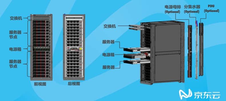 第一、设计理念——高灵活性,因为用户的需求不可预测,用户场景复杂,租用机房较多,每个机房基础设施条件不一样,同时业务类型复杂,资源调配迁移需求比较多,而目前主流的整机柜与通用机相比,无论从 21 英寸的尺寸还是集中的散热方式都有很大的差异,造成了整机柜部署的局限性,很难实现灵活迁移,混合部署。京东云的下一代服务器通过“标准化,模块化,弹性化”,极大地提高了多场景支撑的灵活性。首先我们采用 42U 19 英寸标准机柜为设计单位,节点独立散热,通用性强,实现了整机柜和标准机架服务器任意切换。其次,节点前 IO 设计,机柜后部无任何线缆,所有运维工作均可在冷通道进行,单边维护效率更高,环境更友好。同时通过模块化设计,可实现前后 IO 灵活切换,集中供电和单机供电模式灵活切换。