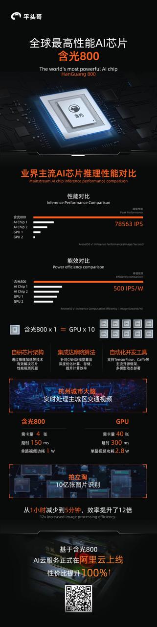 含光 800 将通过阿里云对外输出 AI 算力。基于含光 800 的 AI 云服务当天正式上线,相比传统 GPU 算力,性价比提升 100%。