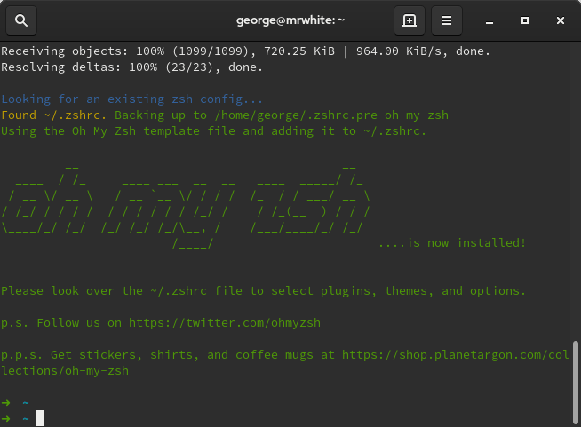 Oh-My-Zsh 是用于管理 Zsh 配置的框架。它捆绑了有用的功能、插件和主题。要了解如何将 Zsh 设置为默认外壳程序,请参见这篇文章。