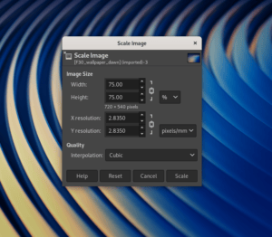 让我们假使我们需要缩小 Fedora 30 背景图像到它当前大小的 75%。为此,选择“ 图像 Image -> 比例 Scale ”,然后在比例对话框上,在单位下拉列表中选择“ 百分比 percentage ”。接下来,输入 “75” 作为宽度或高度,然后按 Tab 键。默认情况下,其它尺寸将自动地调整大小,以相应地与更改的尺寸保持纵横比。现在,保存其它选项不变,并按比例。