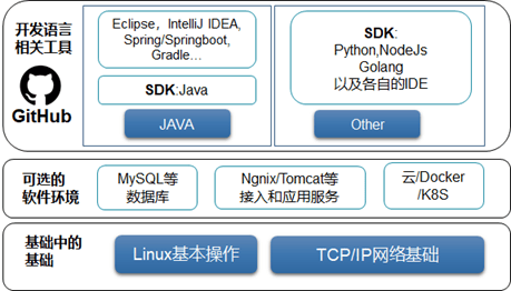 如果是使用 Java 语言,那就应该熟练掌握 Eclipse、IntelliJ IDEA 等集成 IDE,熟悉 Gradle 为主的工程管理软件,熟悉 Spring、Springboot 等 Java 的基础开发组件,熟悉在 IDE 或命令行下对资源路径如 ApplicationContext 等路径的定义,或许还有 myBatis 等流行的组件,这些都可以在 Java 相关的社区和网站找到资料和书籍。