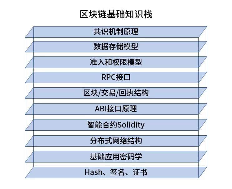 严格来说,这并不是区块链领域的专有知识,只是必须具备的基础知识,包括 SHA3/SHA256/RIPEMD160 等摘要算法,以及这些算法和“区块链地址”的关系,基于公私钥的数字签名和验证方法,数字证书的概念和格式,比如 X.509 证书,以及保存证书/公私钥的文件格式,如 PEM 文件、keystore文件等。