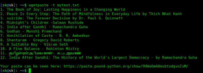 $ wgetpaste -r mytext.txt Your raw paste can be seen here: https://paste.pound-python.org/raw/CUJhQ3jEmr2UvfmD2xCL/