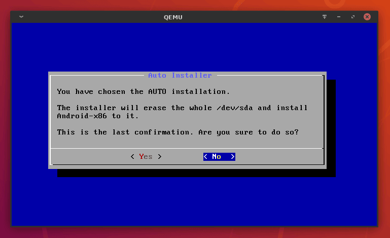 sudo qemu-system-x86_64 -m 2048 -boot d -enable-kvm -smp 3 -net nic -net user -hda android.img -cdrom /home/mhsabbagh/android-x86_64-8.1-r1.iso