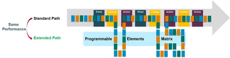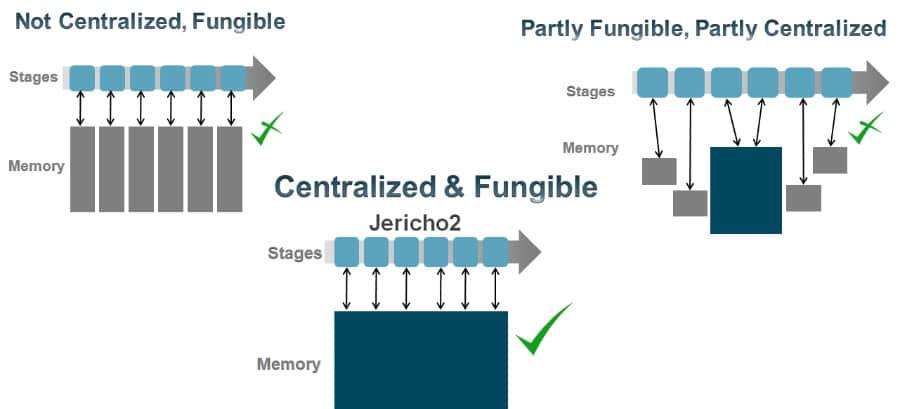 另外 Jericho2 真正的模块化表项结构,所有表项共享同一块物理缓存,极大增加了片上资源的使用效率。管线上所有处理节点可以并行访问,根据不同的应用场景进行逻辑表项的灵活划分,使得同样的硬件可以应用在完全不同的使用场景。丰富的表项资源使得新一代的网关能够完全满足用户现有甚至未来可见数年的规格需求。