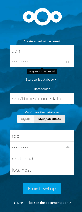 在你喜欢的浏览器中,访问 http://your_server_ip/nextcloud 并输入字段: