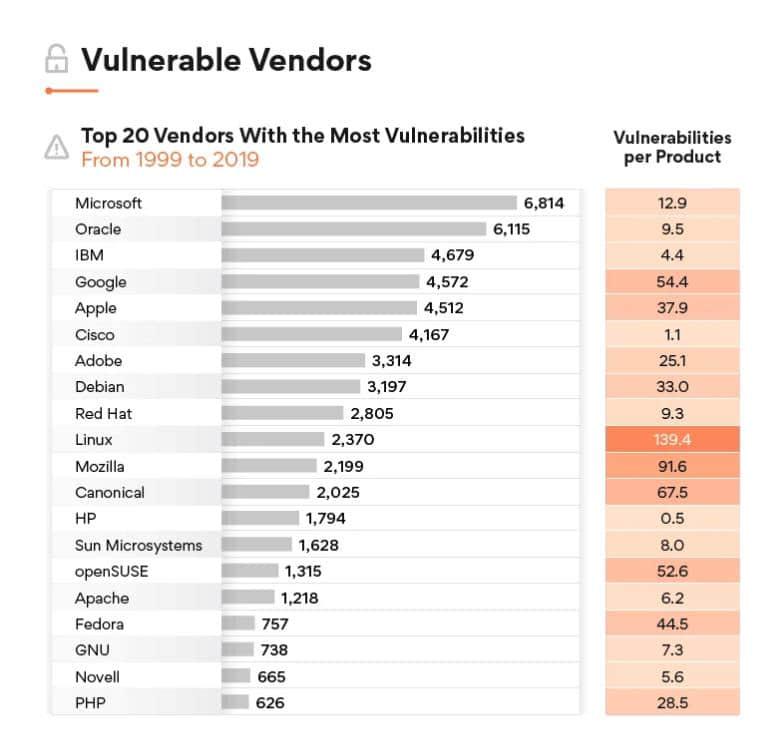 但是回溯这整整 20 年来看,这些数据所描述的景象更加完整。在查看整个公司的产品时,微软产品的安全缺陷比任何其他公司都要多。自 1999 年以来,微软产品总共发现了 6814 个漏洞。以下是前 5 名: