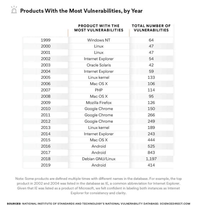 根据其数据,在 1999 - 2019 年期间,Debian Linux 是所有操作系统中带有安全漏洞最多的一个。在此期间,在 Debian Linux 中报告了 3067 个漏洞,在 Ubuntu 中报告了 2007 个漏洞。另一方面,Windows 7 受到了 1283 个漏洞的困扰,在 Windows 10 中才发现了 1111 个漏洞。