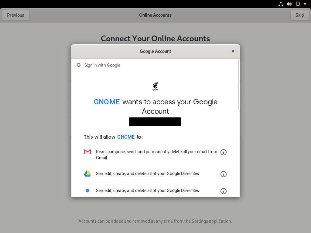 请注意,此信息仅传输给 Google,而不传输给 GNOME 项目。下一个页面要求你授予访问权限,这是必需的,以便系统桌面可以与 Google 进行交互。向下滚动查看访问请求,然后选择“允许”继续。