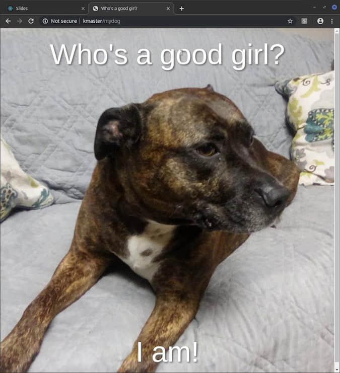 同样,我们需要部署一些东西。碰巧我的狗有一条她想让全世界都知道的信息,她想了好久了。因此,我专门为她制作了一些 HTML(可从示例 zip 文件中获得)。同样,我们将使用配置映射的技巧来托管这些 HTML。这次我们将把整个目录(html 目录)放到配置映射中,但是调用是相同的。
