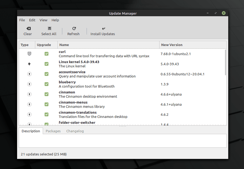 安装后首先应该马上检查的是 —— 使用更新管理器进行系统更新,如上图所示。