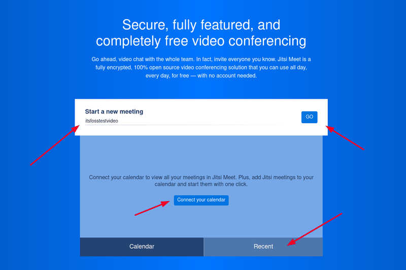 要使它在 Linux 上运行,你不需要做任何其他事情。你只需要前往它的官方 Jitsi Meet 实例,然后输入会议名称即可创建或加入。