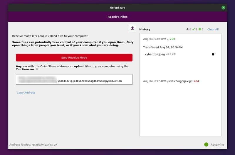 你只需要点击 “Start Receive Mode” 按钮就可以开始了。接下来,你会得到一个 OnionShare 地址(就像共享文件时一样)。