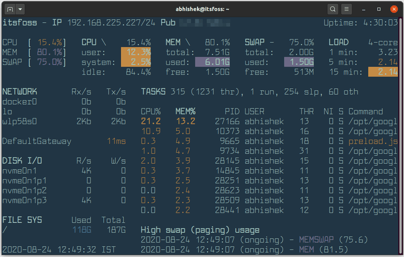 你可以立即观察到,它将很多不同的信息整合在一个屏幕上。我喜欢它在顶部显示电脑的公共和私人 IP: