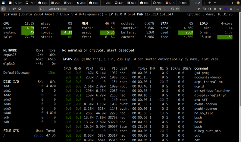 Glances 是一个系统监控工具,它把这些都联系在一起,并提供了更多的功能。我最喜欢的是,你可以在远程 Linux 服务器上运行 Glances 来监控本地系统的系统资源,也可以通过 Web 浏览器监控。