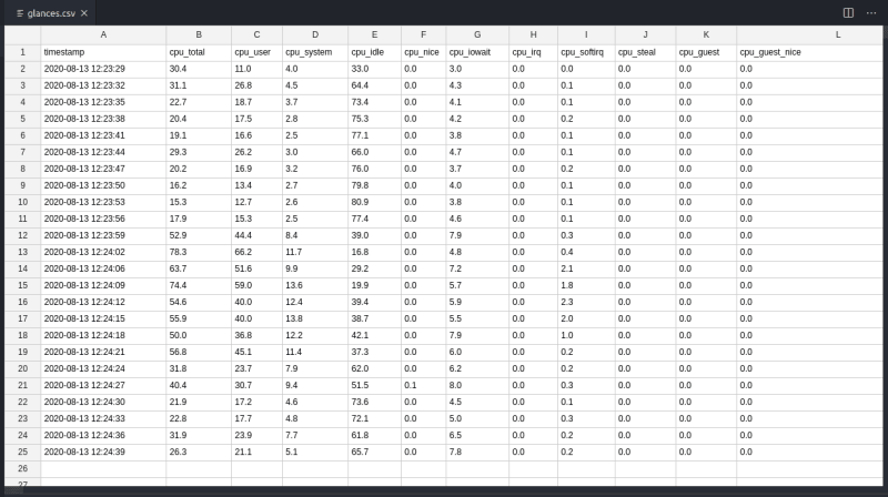 /tmp/glances.csv 是文件的位置。数据以时间序列的形式整齐地填入。