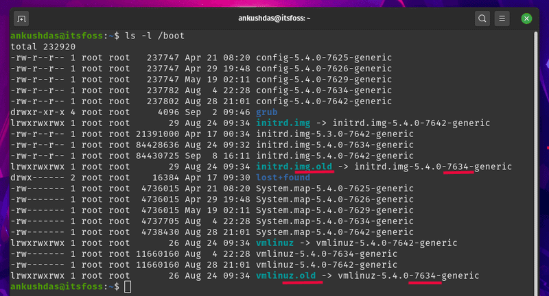 在上面的屏幕截图中,我已经指出了我系统上的当前内核和旧内核,因此你必须注意你系统上的内核。