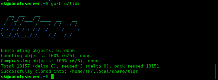 Enumerating objects: 6, done. Counting objects: 100% (6/6), done. Compressing objects: 100% (6/6), done. Total 18157 (delta 0), reused 3 (delta 0), pack-reused 18151 Successfully cloned into: /home/sk/.local/share/tldr
