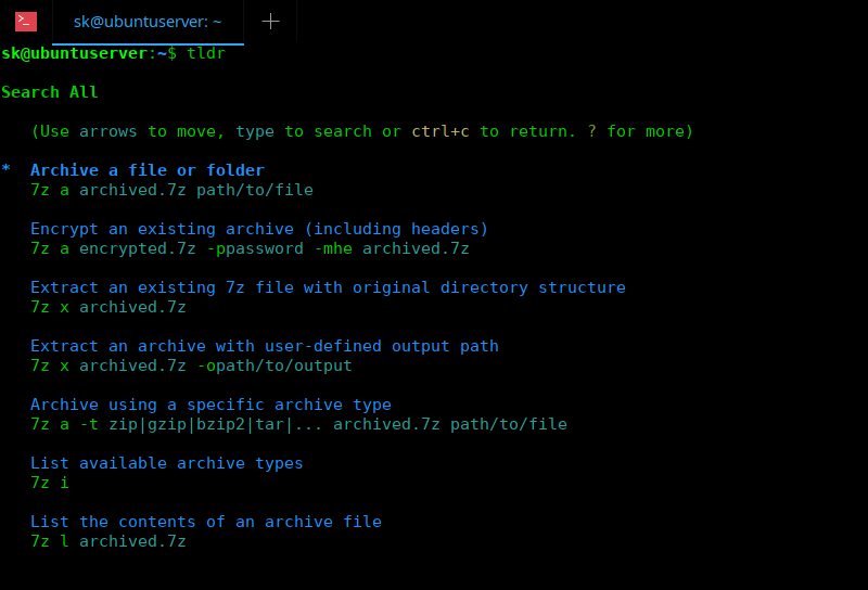 输入不带任何选项的 tldr 命令,以字母顺序显示所有命令示例。
