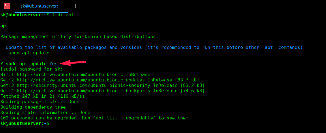 从列表中选择任意示例命令并按回车键。在选定的命令前会看到一个 * 符号。例如,我选择第一个命令即 sudo apt update。现在,它会问你是否继续。如果命令正确,只需键入 y 继续,并输入 sudo 密码运行所选命令。