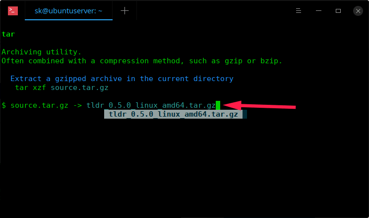 如果将文件下载到其他位置,只需键入完整路径,例如 /home/sk/Downloads/tldr_0.5.0_linux_amd64.tar.gz。