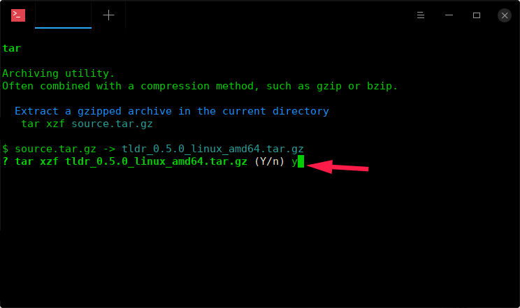 我们下载了 tar.gz 文件。所以我将打开 TLDR 手册的 tar 页面。