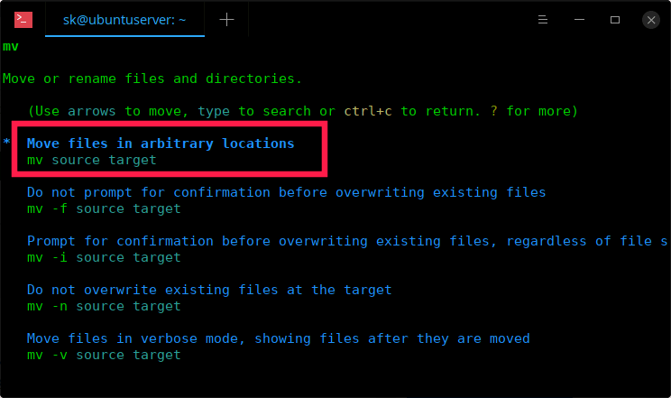 我们解压了文件。现在我们需要将文件移动到另一个位置。为了将文件从一个位置移动到另一个位置,我们使用 mv 命令。所以,让我们打开 TLDR 手册的 mv 命令。