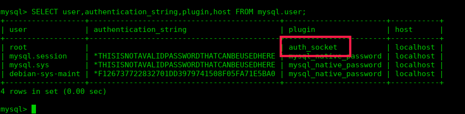 +------------------|-------------------------------------------|-----------------------|-----------+ | user | authentication_string | plugin | host | +------------------|-------------------------------------------|-----------------------|-----------+ | root | | auth_socket | localhost | | mysql.session | *THISISNOTAVALIDPASSWORDTHATCANBEUSEDHERE | mysql_native_password | localhost | | mysql.sys | *THISISNOTAVALIDPASSWORDTHATCANBEUSEDHERE | mysql_native_password | localhost | | debian-sys-maint | *F126737722832701DD3979741508F05FA71E5BA0 | mysql_native_password | localhost | +------------------|-------------------------------------------|-----------------------|-----------+ 4 rows in set (0.00 sec)