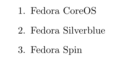 \begin{enumerate} \item Fedora CoreOS \item Fedora Silverblue \item Fedora Spin \end{enumerate}