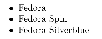 \begin{itemize}[noitemsep] \item Fedora \item Fedora Spin \item Fedora Silverblue \end{itemize}