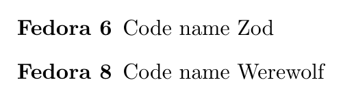 \begin{description} \item[Fedora 6] Code name Zod \item[Fedora 8] Code name Werewolf \end{description}