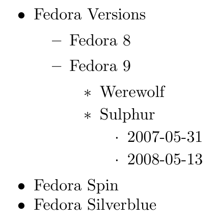 \begin{enumerate}[noitemsep] \item Fedora Versions \begin{enumerate} \item Fedora 8 \item Fedora 9 \begin{enumerate} \item Werewolf \item Sulphur \begin{enumerate} \item 2007-05-31 \item 2008-05-13 \end{enumerate} \end{enumerate} \end{enumerate} \item Fedora Spin \item Fedora Silverblue \end{enumerate}