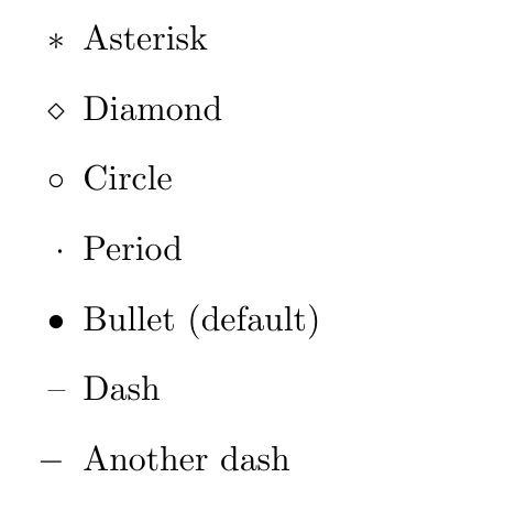 % 方式一 \begin{itemize} \item[$\ast$] Asterisk \item[$\diamond$] Diamond \item[$\circ$] Circle \item[$\cdot$] period \item[$\bullet$] Bullet (default) \item[--] Dash \item[$-$] Another dash \end{itemize}