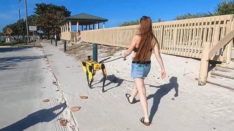 美国佛州一女子在海滩上遛波士顿动力开发的机器狗