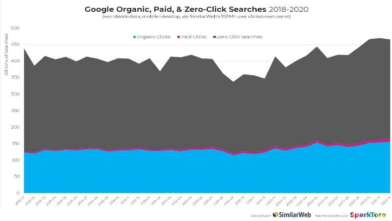 2019 年的一项研究发现,50.33% 的 Google 搜索没有导致外链点击。2020 年这一比例进一步提高到三分之二左右。这一数据来自 SimilarWeb 对 2020 年 51 万亿次 Google 搜索的分析。在这些搜索中,33.59% 点击了搜索结果,1.59% 点击了付费搜索结果,其余 64.82% 则是零点击。