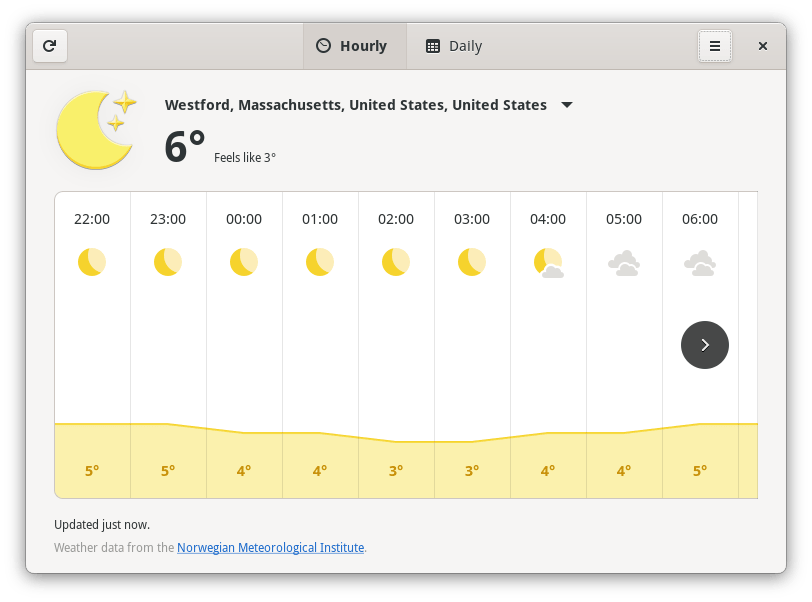 GNOME “天气”为这个版本进行了重新设计,具有两个视图,一个是未来 48 小时的小时预报,另一个是未来 10 天的每日预报。