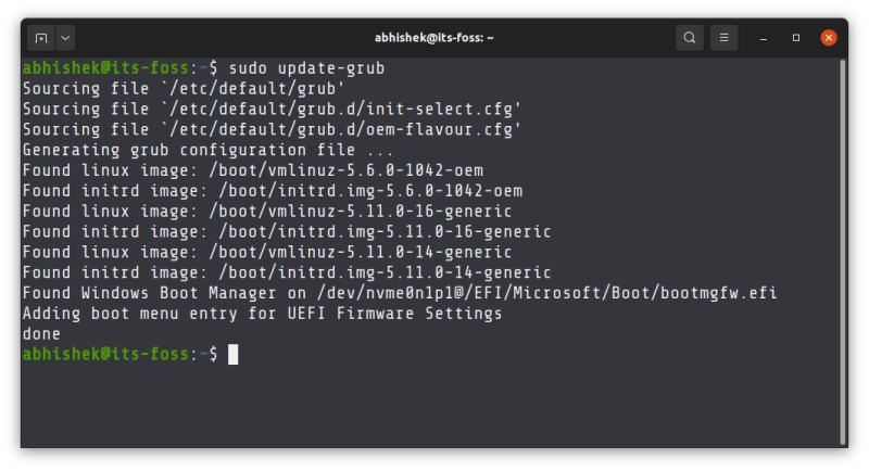 你已经修改了 GRUB 引导器的配置,但是在你更新 GRUB 之前这些更改都不会生效。使用下面的命令来更新: