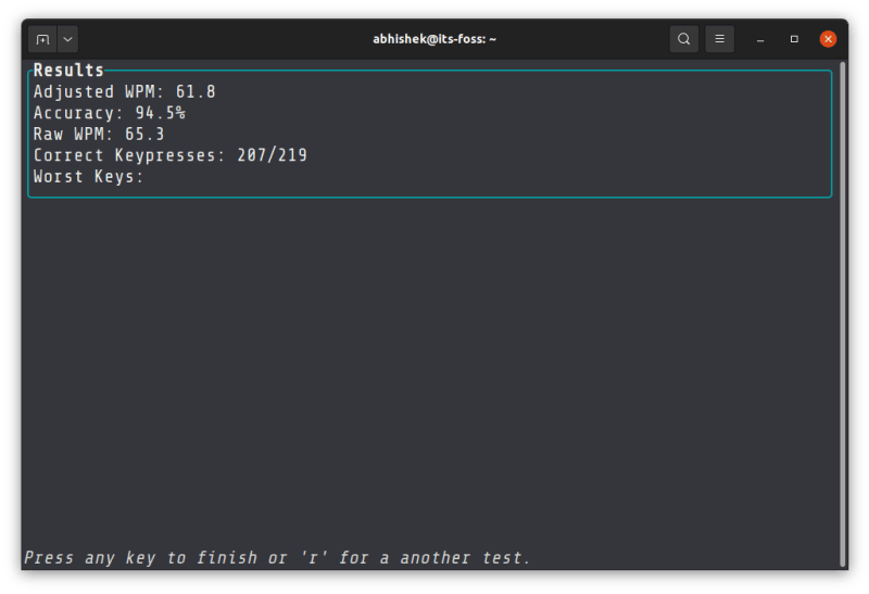 当你打完所有显示的单词后,你会得到你的打字速度(每分钟字数)、准确率和正确按键数的结果。如果你没有心情打完全部,你可以使用 Ctrl+C 退出 Ttyper。