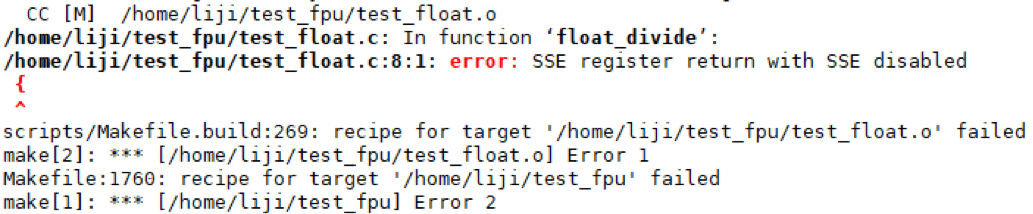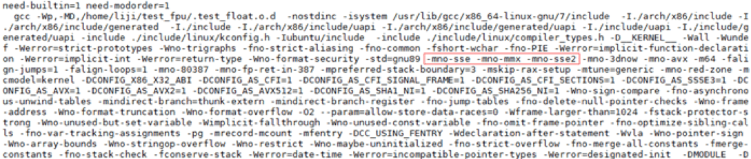 提示 SSE 寄存器返回的报错信息为 “SSE disabled”。我们执行 make V=1 查看关键的编译信息: